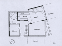 Der Essbereich wurde als "untergeordnetes Bauteil" über die seitliche Baugrenze hinausgedreht, um genug Platz für den Wohn- und Essbereich auf der Gartenseite zu schaffen. |