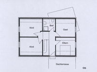 Ein Höhenversprung in der Erdgeschossdecke sorgt dafür, dass oben wie unten die jeweils größeren Räume auch höher sind als die kleinen Räume. Dadurch sind in den Kinderzimmern Schlafgalerien unterm Dach möglich geworden, der Ess- und Wohnbereich wirkt großzügiger. |